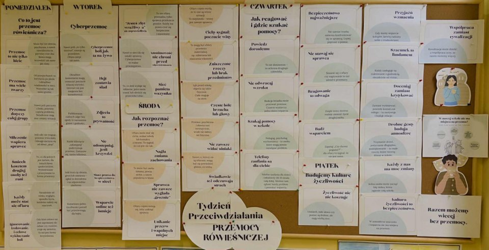 Samorząd Uczniowski przygotował merytoryczną gazetkę tematyczną, w której każdego dnia pojawiały się nowe informacje i inspiracje związane z tematyką tygodnia. Nie zabrakło też zaangażowania uczniów w wykonanie kolorowych plakatów, które ozdobiły szkolne korytarze i przypominały, jak ważne są wzajemny szacunek i empatia.